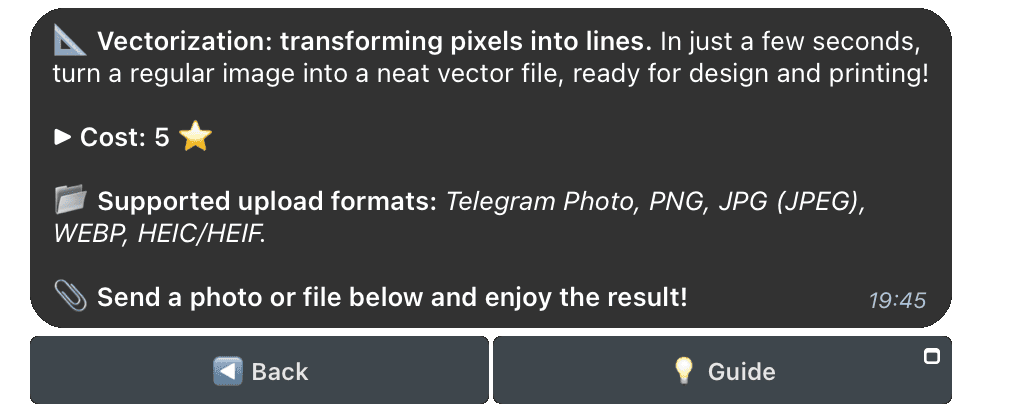 To use the vectorization feature, go to the 📐 Vectorization section in the main menu or enter the /vectorize command. This will open the image upload page.